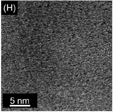 圖F為一個典型的砂磨后的Ta-LLZO顆粒的STEM照片。經過砂磨的細顆粒表面較為粗糙,對其中白色虛線框標記的區域做選區電子衍射(SAED),結果如圖G所示。電子衍射花樣為展寬明顯的多晶德拜環,最亮的環對應于晶面間距為0.31nm的(240)面。該面間距比純Ta-LLZO粉體和H+交換后的Ta-LLZO晶格中的數值大。說明砂磨后的細Ta-LLZO顆粒表面和內部晶格變形并多晶化。圖H為顆粒表面的HRTEM原子排列圖像。該圖像表明,Ta-LLZO在極小的疇區內(1~2nm)有序排列,但不同疇區的排列完全是無序的,進一步證實了砂磨顆粒的多晶化,利于后續燒結。
